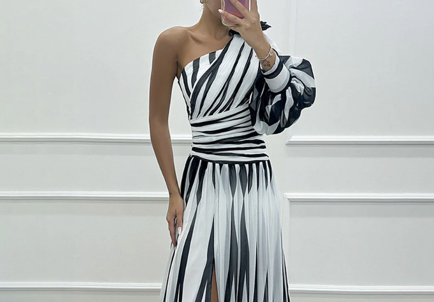 ✨ Stijlvol & Elegant – One-Shoulder Gestreepte Maxi-jurk